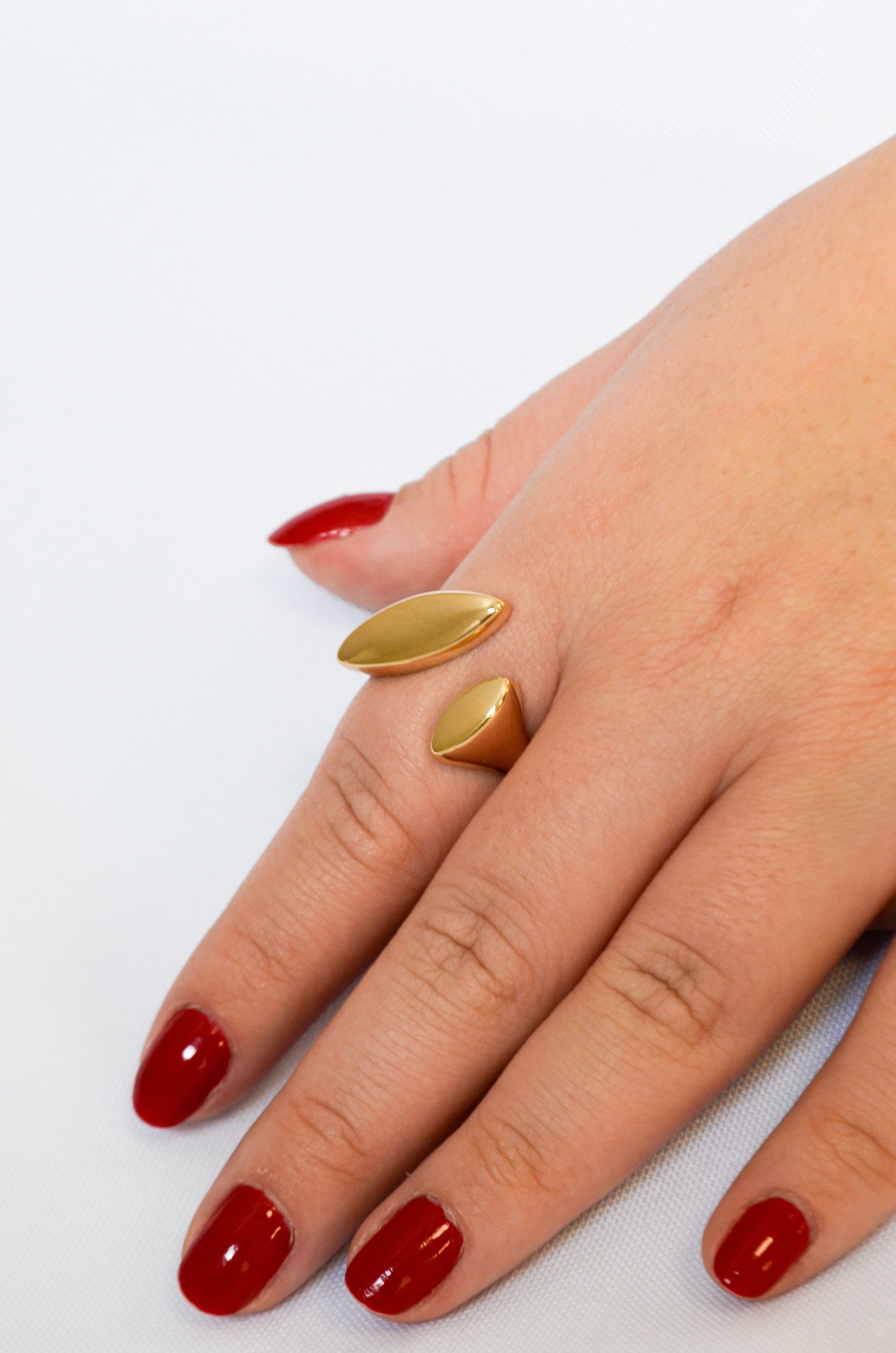 Este anel é perfeito para quem busca uma peça elegante e versátil. O design liso e minimalista é complementado pelas navetes, que dão um toque de sofisticação ao acessório. Além disso, o banho em ouro 18k garante um brilho duradouro e resistência à oxidação.