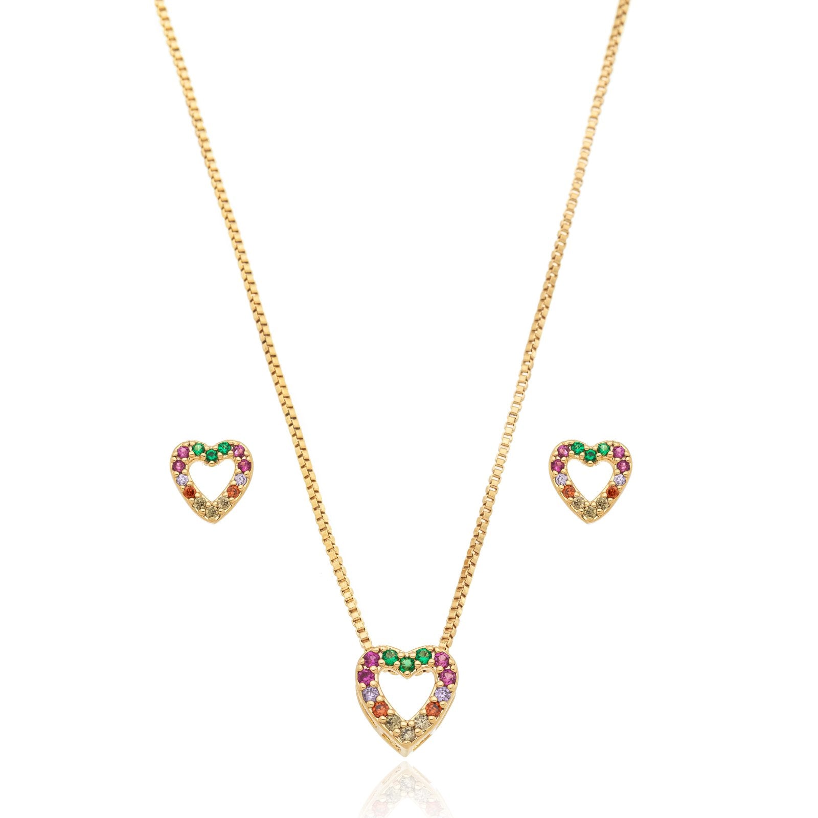 Conjunto de brinco e gargantilha de coração com zircônias coloridas banhado a ouro 18k