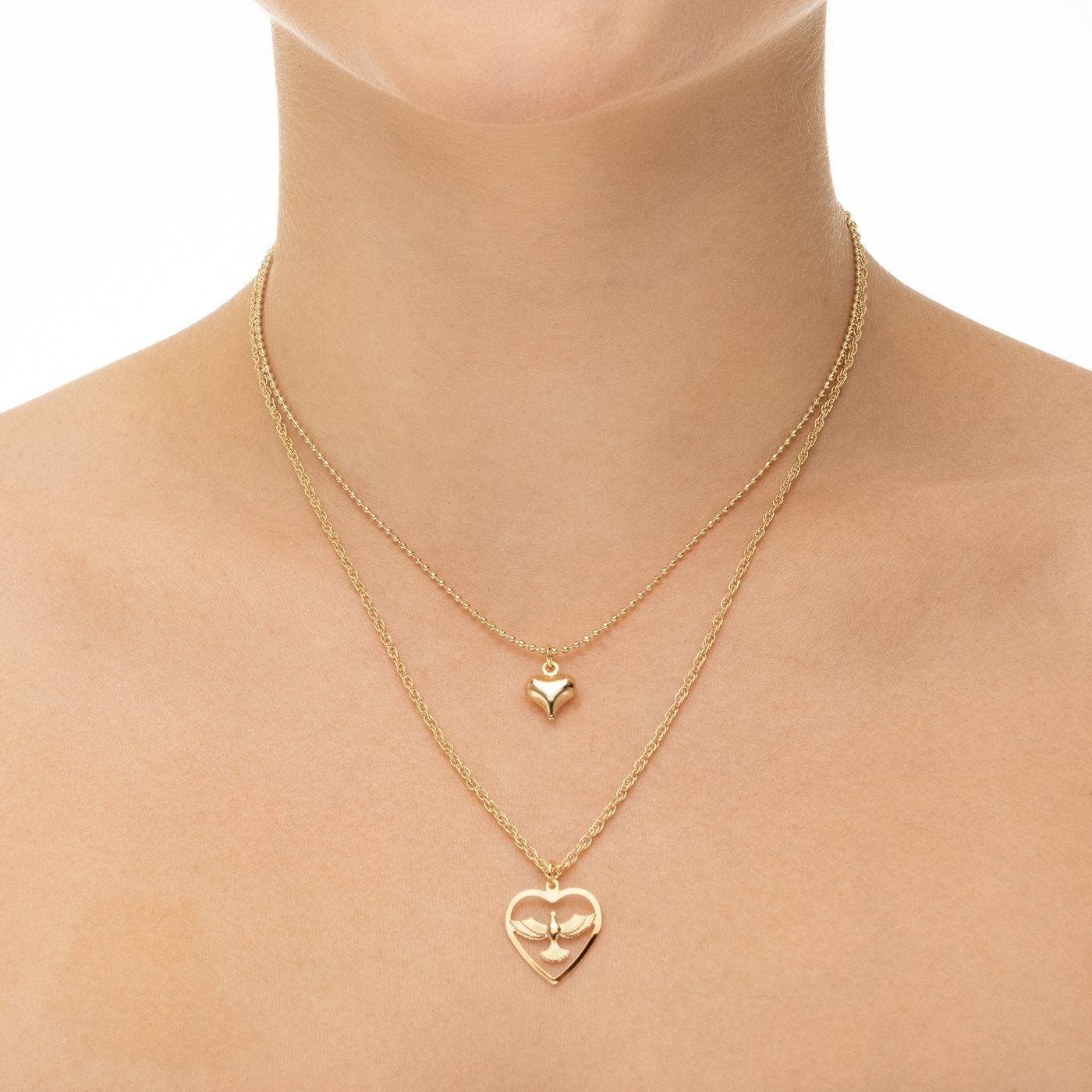 Você está procurando por uma joia elegante e cheia de significado? Então a Gargantilha dupla com coração e espírito santo banhada a ouro 18k é a escolha perfeita para você!