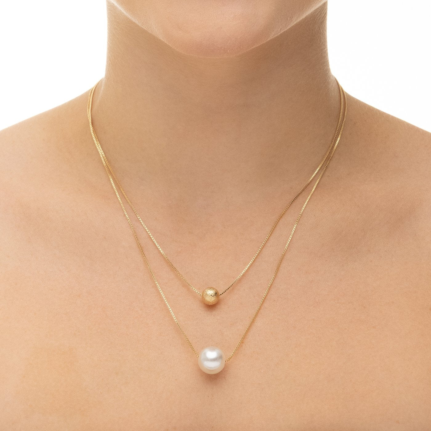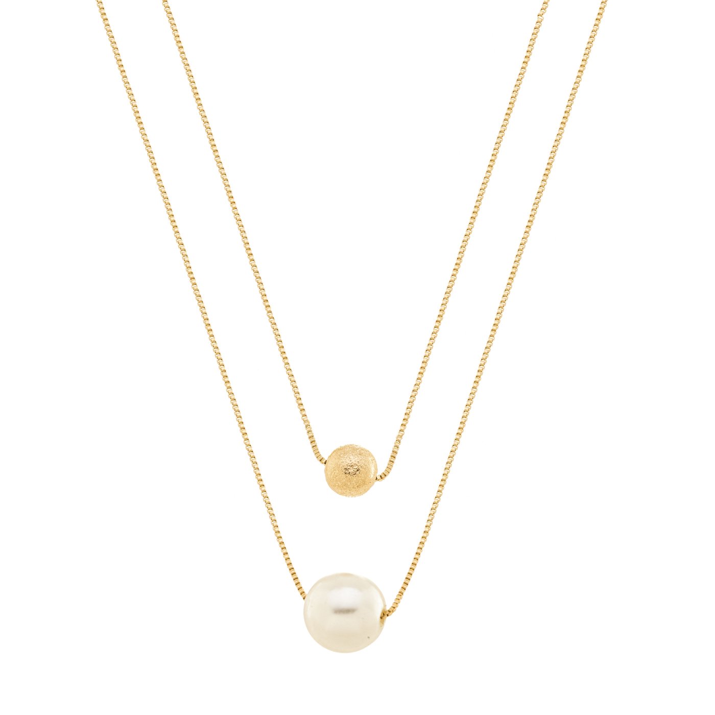 Gargantilha dupla com pérola e bola fosca banhada a ouro 18k